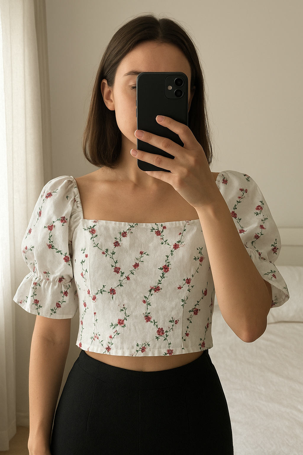 Zara Flutter ruffle Sleeve Floral white flower Crop Top size L standing straight facing the camera, in a softly lit bedroom setting, with gentle natural light filtering through a window.