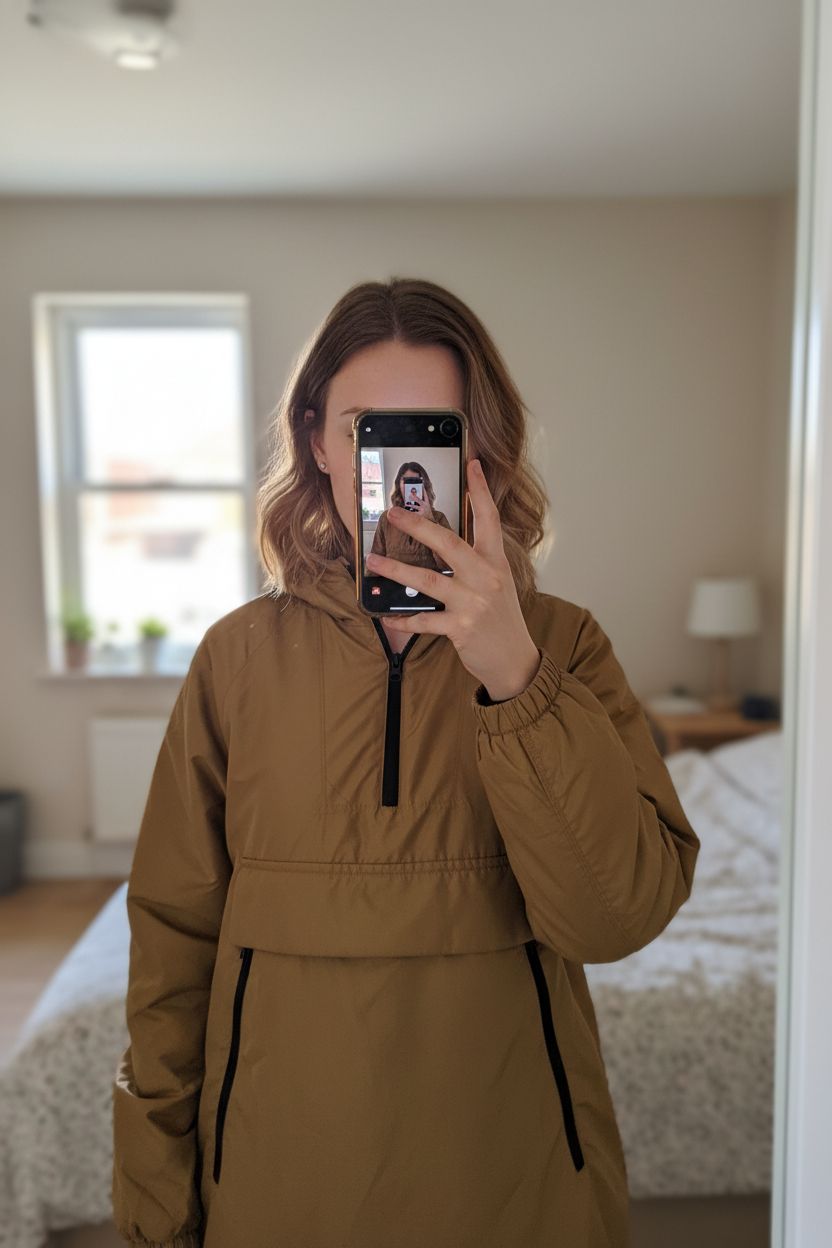 Zara girls hooded jacket Age 13-14 standing straight facing the camera, in a softly lit bedroom setting, with gentle natural light filtering through a window.