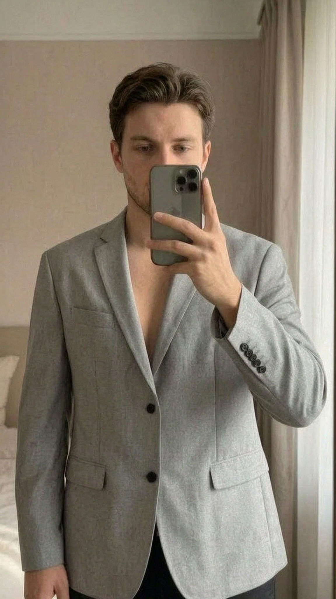 Zara Grey Blazer | Smart Suit Jacket | Size 46R standing straight facing the camera, in a softly lit bedroom setting, with gentle natural light filtering through a window.
