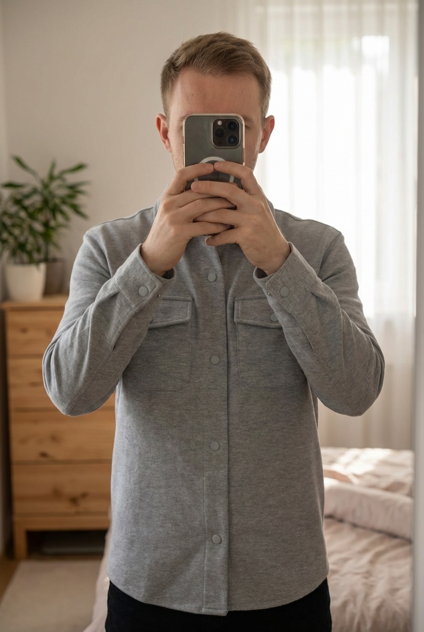 ZARA Grey Overshirt / Lightweight Jacket – Size S standing straight facing the camera, in a softly lit bedroom setting, with gentle natural light filtering through a window.