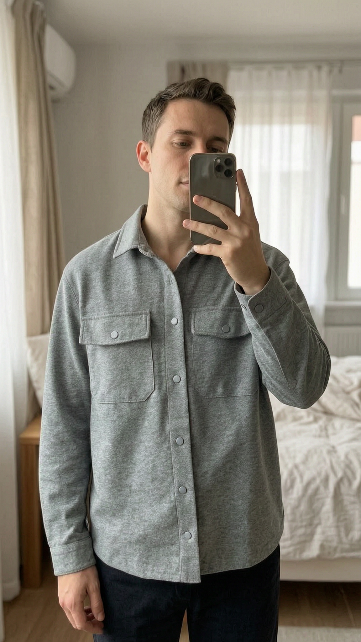 ZARA Grey Overshirt / Lightweight Jacket – Size S standing straight facing the camera, in a softly lit bedroom setting, with gentle natural light filtering through a window.