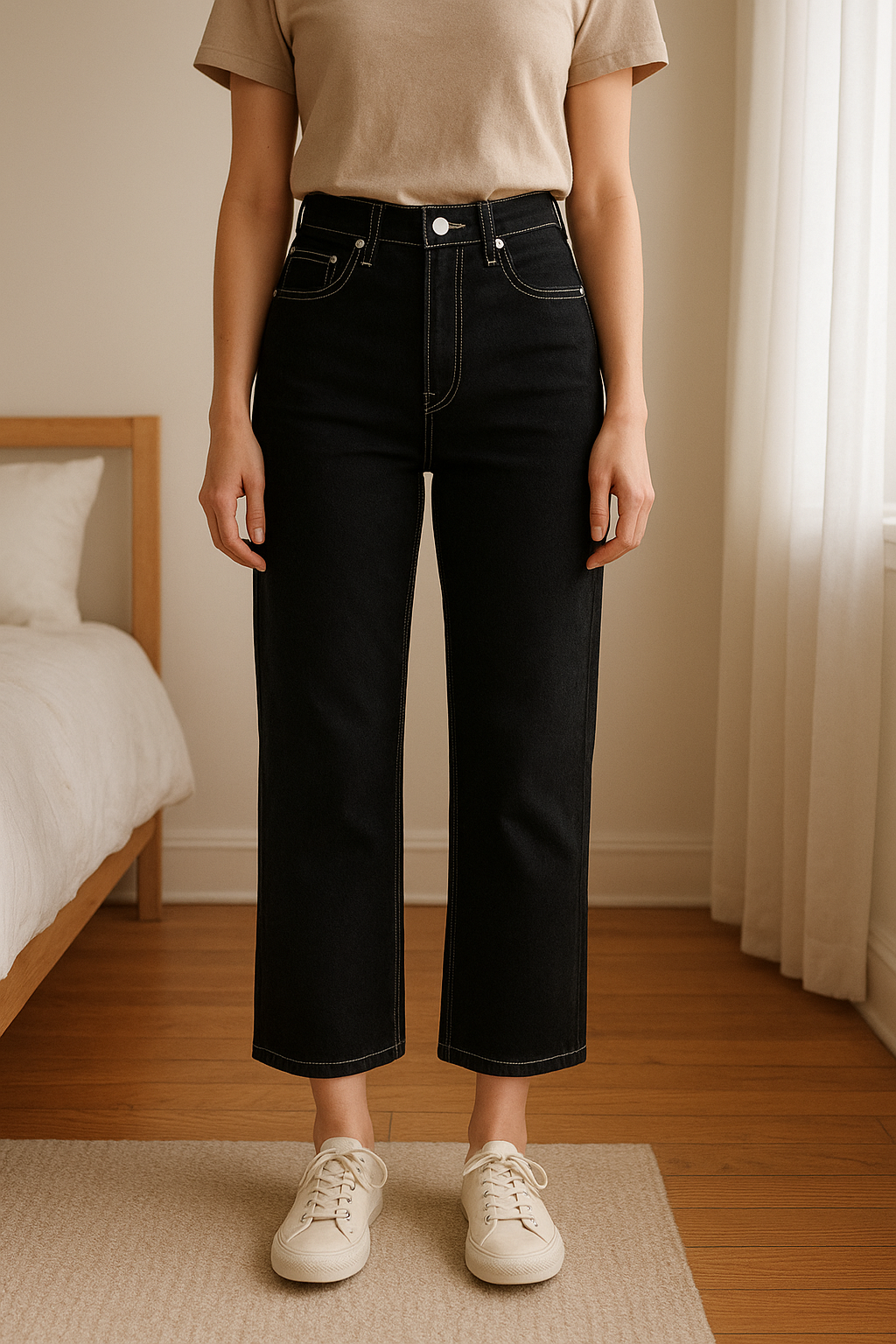 Zara high waist culotte jeans midnight back standing straight facing the camera, in a softly lit bedroom setting, with gentle natural light filtering through a window.