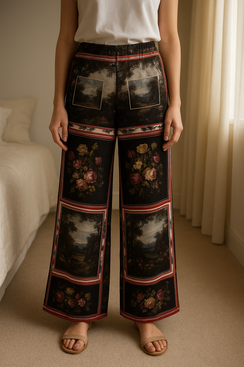 Zara magas derekú mintás női nadrág – M méret, hibátlan állapotban standing straight facing the camera, in a softly lit bedroom setting, with gentle natural light filtering through a window.