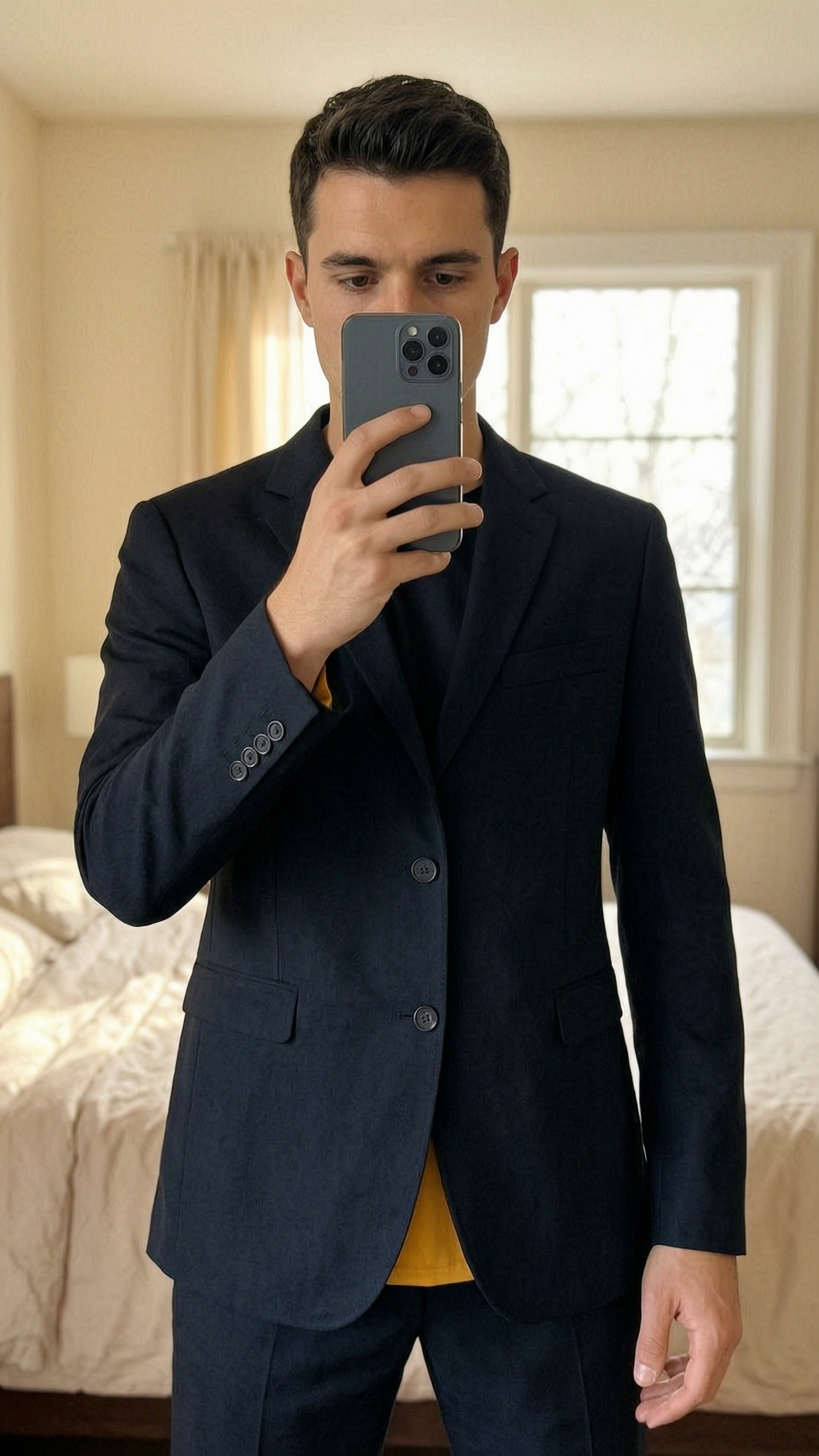 Zara Man Black Tailored Blazer | EUR 54 / UK L standing straight facing the camera, in a softly lit bedroom setting, with gentle natural light filtering through a window.