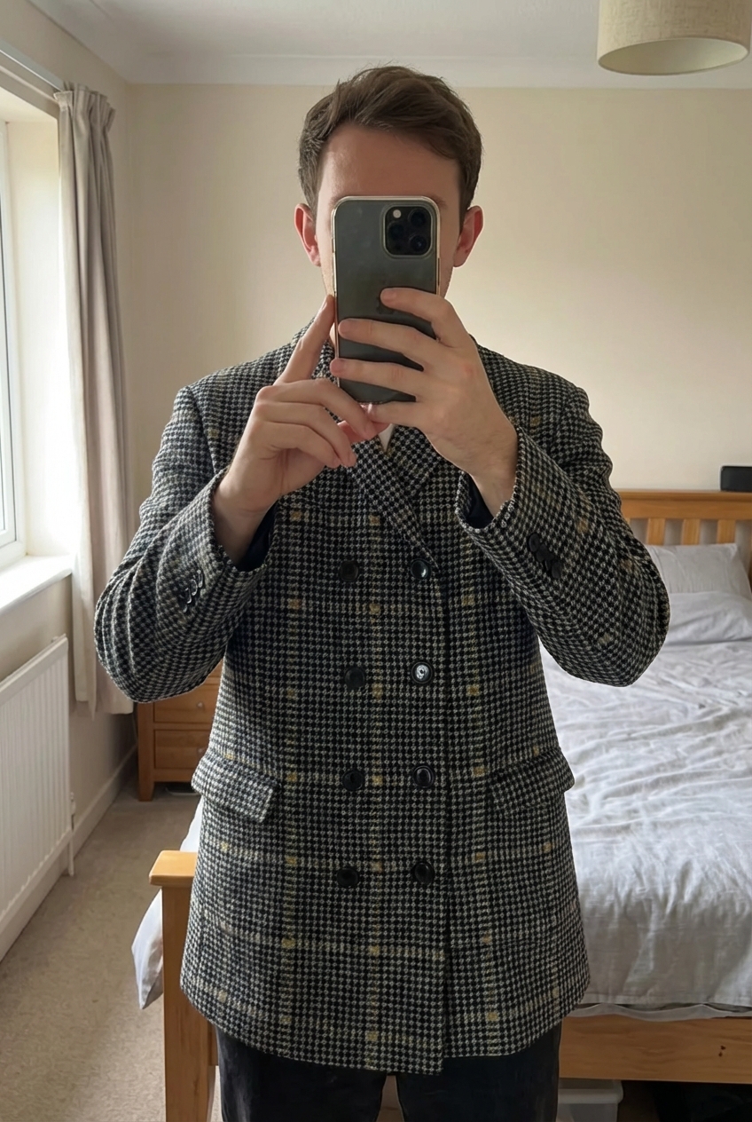 Zara Man Double-Breasted Coat standing straight facing the camera, in a softly lit bedroom setting, with gentle natural light filtering through a window.