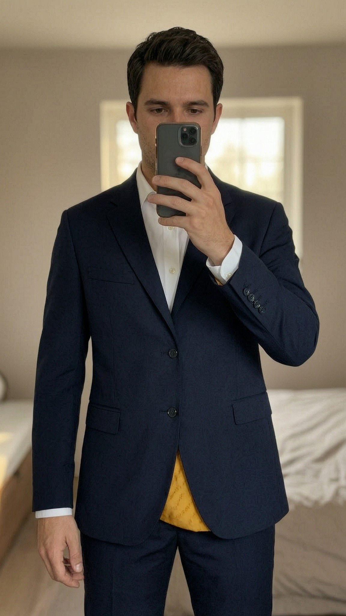 Zara Man Navy Tailored Blazer | EUR 54 / UK L standing straight facing the camera, in a softly lit bedroom setting, with gentle natural light filtering through a window.