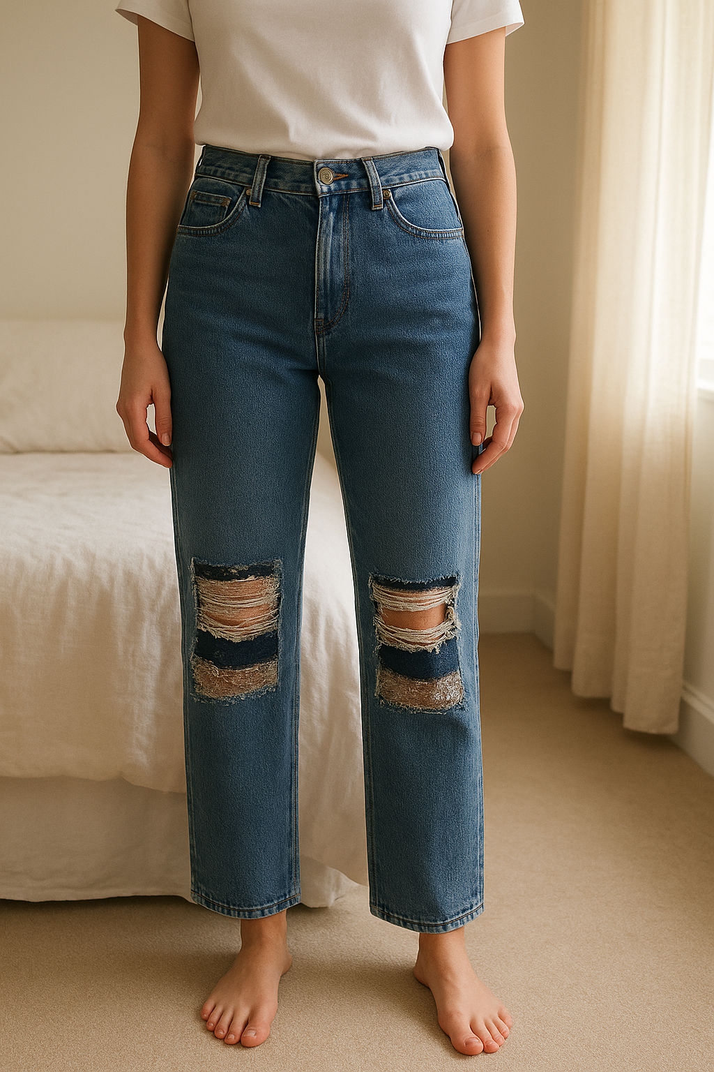 Zara mid-rise jeans with sequins standing straight facing the camera, in a softly lit bedroom setting, with gentle natural light filtering through a window.