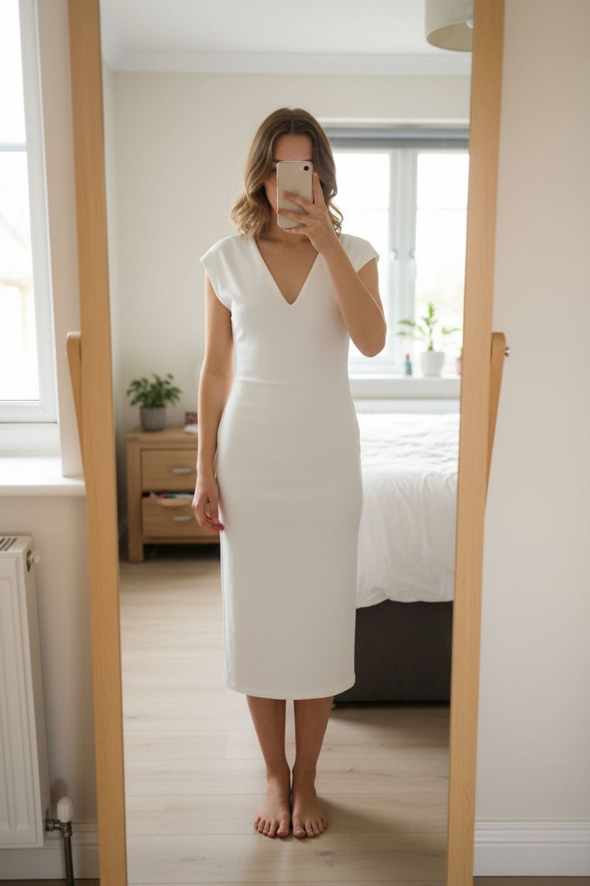 Zara midi dress standing straight facing the camera, in a softly lit bedroom setting, with gentle natural light filtering through a window.