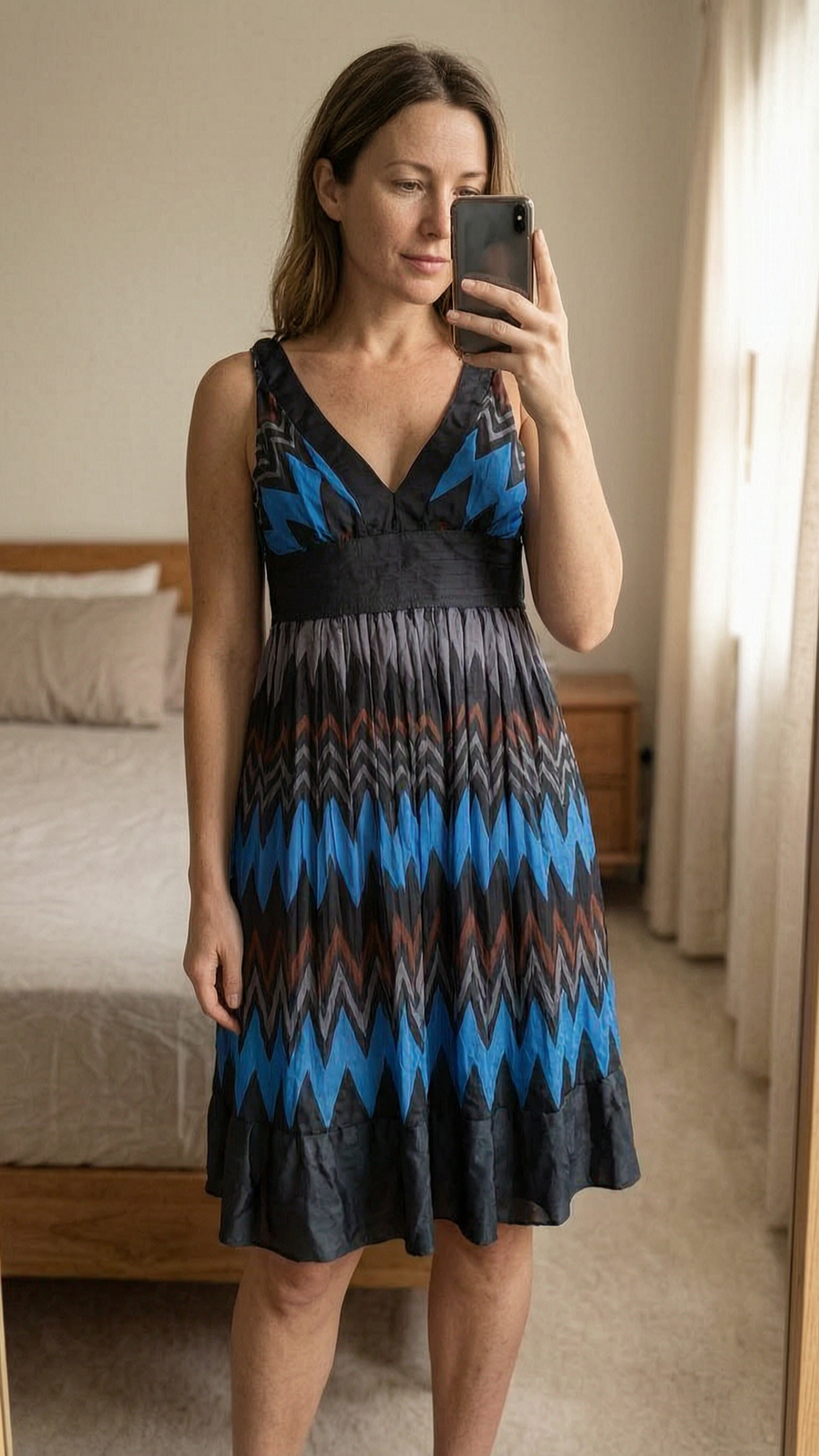 A person in Zara Midi Stylish Dress Size S standing straight facing the camera, in a softly lit bedroom setting, with gentle natural light filtering through a window.