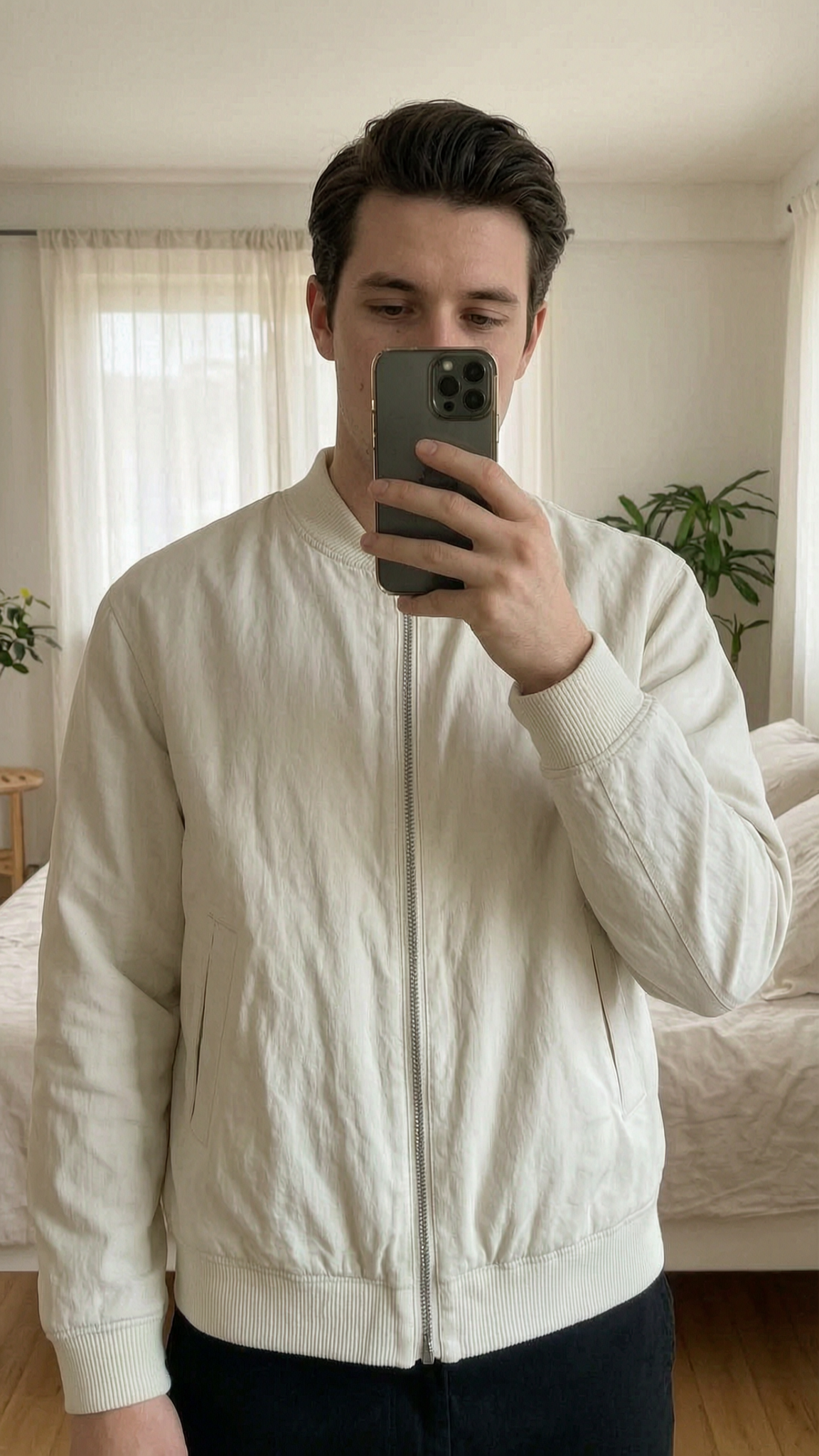 ZARA Off-White Linen Jacket | Summer Bomber standing straight facing the camera, in a softly lit bedroom setting, with gentle natural light filtering through a window.