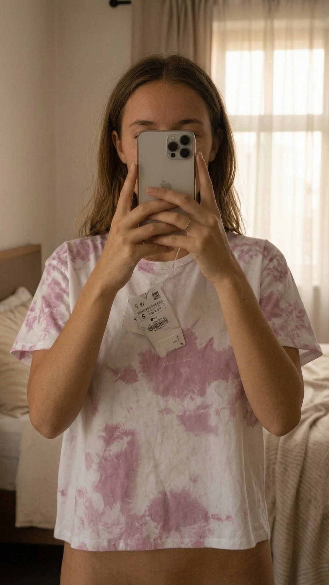 Zara Pink & White Tie-Dye T-Shirt – Size S | New With Tags standing straight facing the camera, in a softly lit bedroom setting, with gentle natural light filtering through a window.