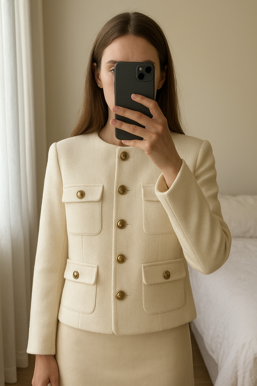 Zara Textured Cream Jacket | Size XS | New with Tags standing straight facing the camera, in a softly lit bedroom setting, with gentle natural light filtering through a window.
