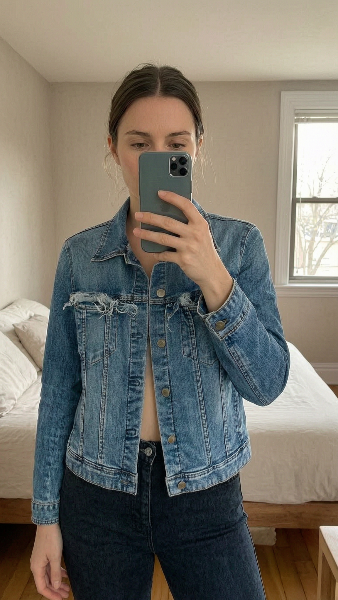Zara Trafaluc Denim Distressed Worn Look Jacket Size UK M standing straight facing the camera, in a softly lit bedroom setting, with gentle natural light filtering through a window.