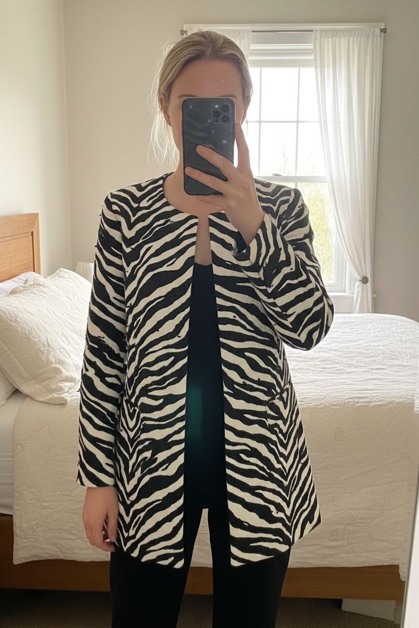 Zara Woman Zebra Print Textured Coat / Jacket – Black & White M 10 12 standing straight facing the camera, in a softly lit bedroom setting, with gentle natural light filtering through a window.