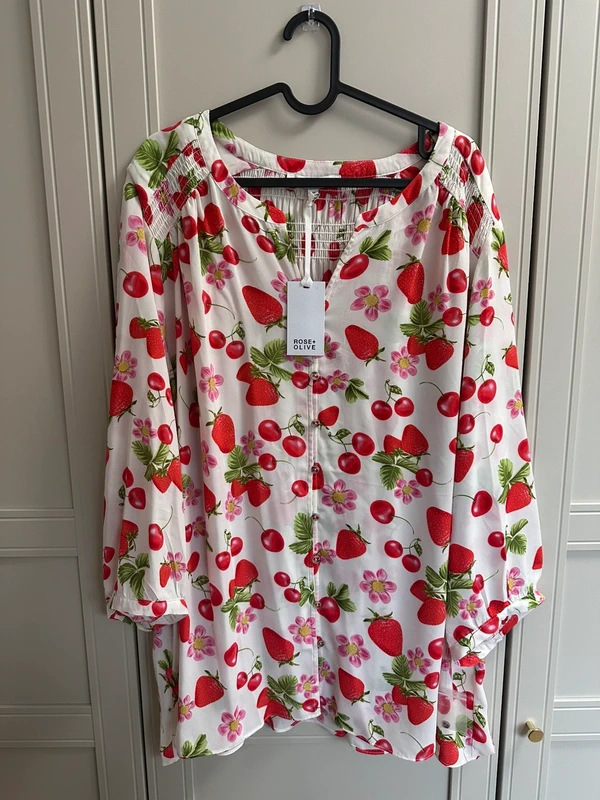 - Size versatile: blouse 3XL; can be worn as a short dress (S-M) with belt - White blouse with strawberry, cherry and pink flowers - Light viscose/polyester, long sleeves, round neck - Good condition, clean, ready to wear