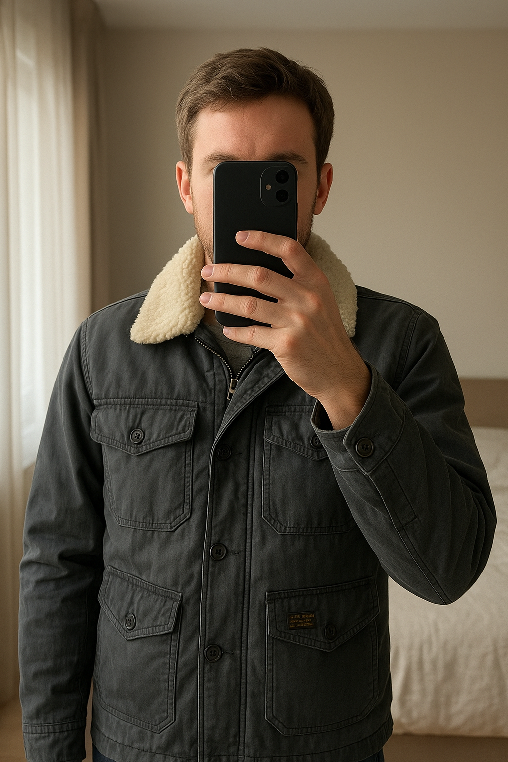 Abercrombie saharienne bleu marine debout, face à la caméra, dans une chambre à la lumière douce, avec une lumière naturelle filtrant par la fenêtre.