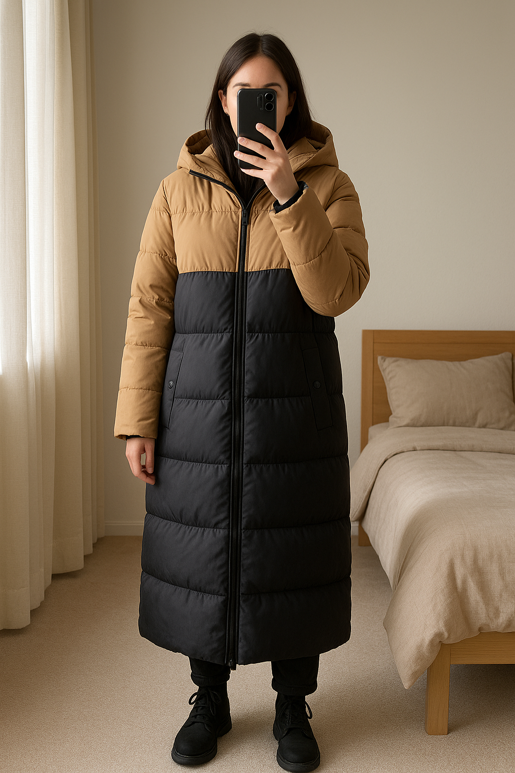 Abrigo "Color Block" de Stradivarius de pie, mirando a la cámara, en un dormitorio con luz suave y natural filtrándose por la ventana.