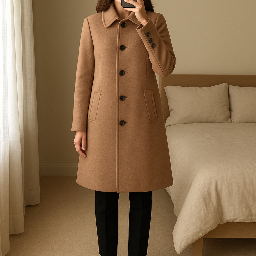 Abrigo midi marrón de pie, mirando a la cámara, en un dormitorio con luz suave y natural filtrándose por la ventana.