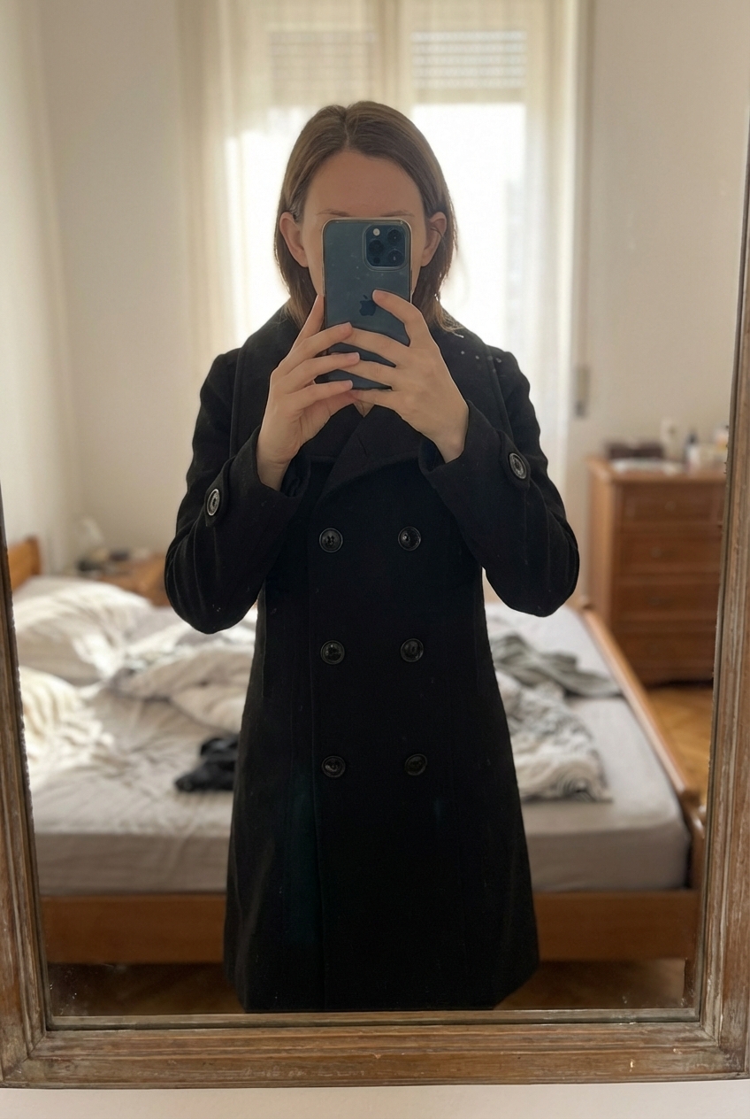 Abrigo negro de pie, mirando a la cámara, en un dormitorio con luz suave y natural filtrándose por la ventana.