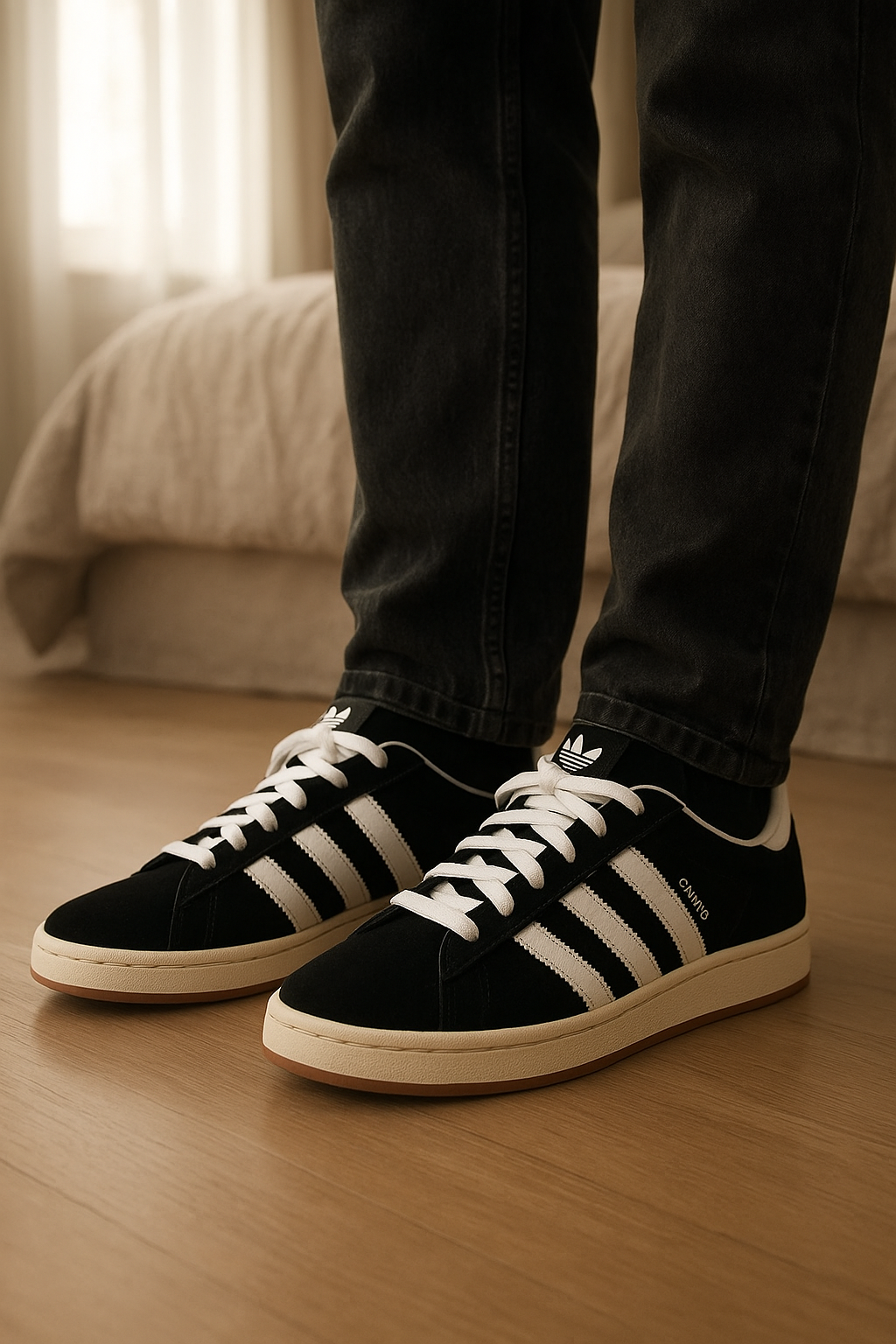 Adidas Campus Original`s 00s em pé, de frente para a câmera, em um quarto com iluminação suave e luz natural filtrando pela janela.