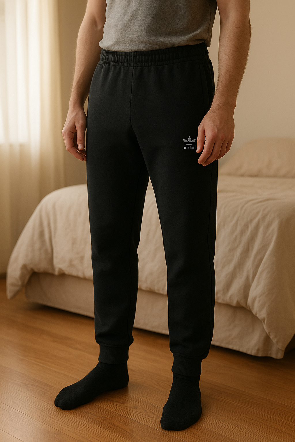 Adidas férfi melegítő standing straight facing the camera, in a softly lit bedroom setting, with gentle natural light filtering through a window.