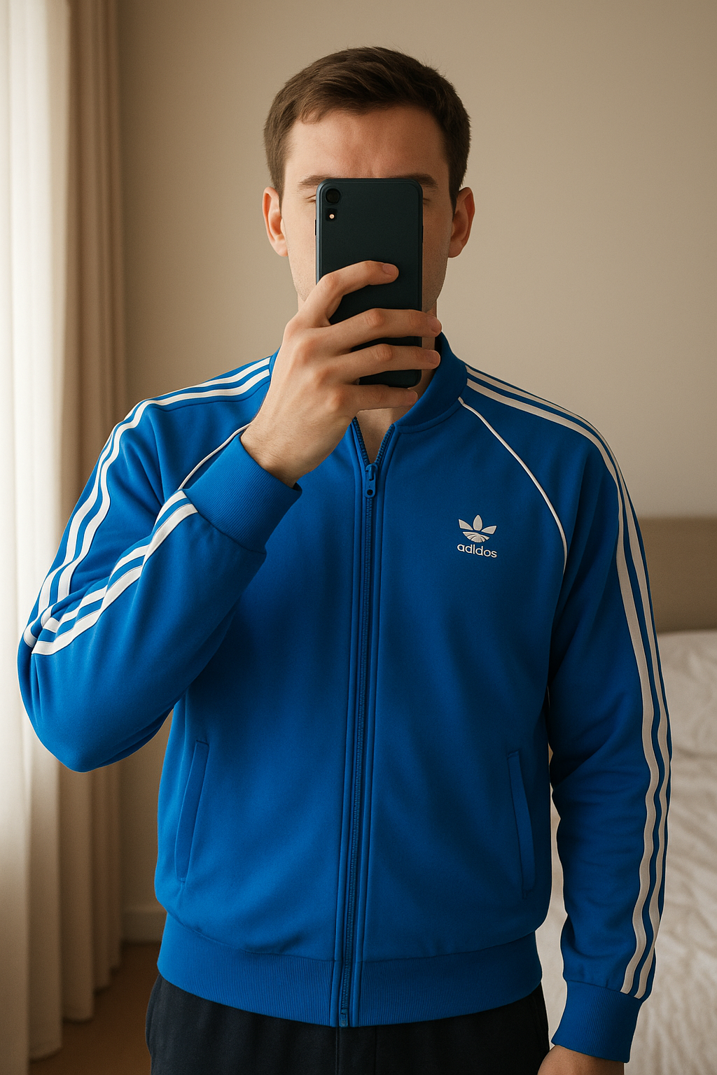 Adidas Originals Firebird Track Jacket Primeblue (Men's) M standing straight facing the camera, in a softly lit bedroom setting, with gentle natural light filtering through a window.