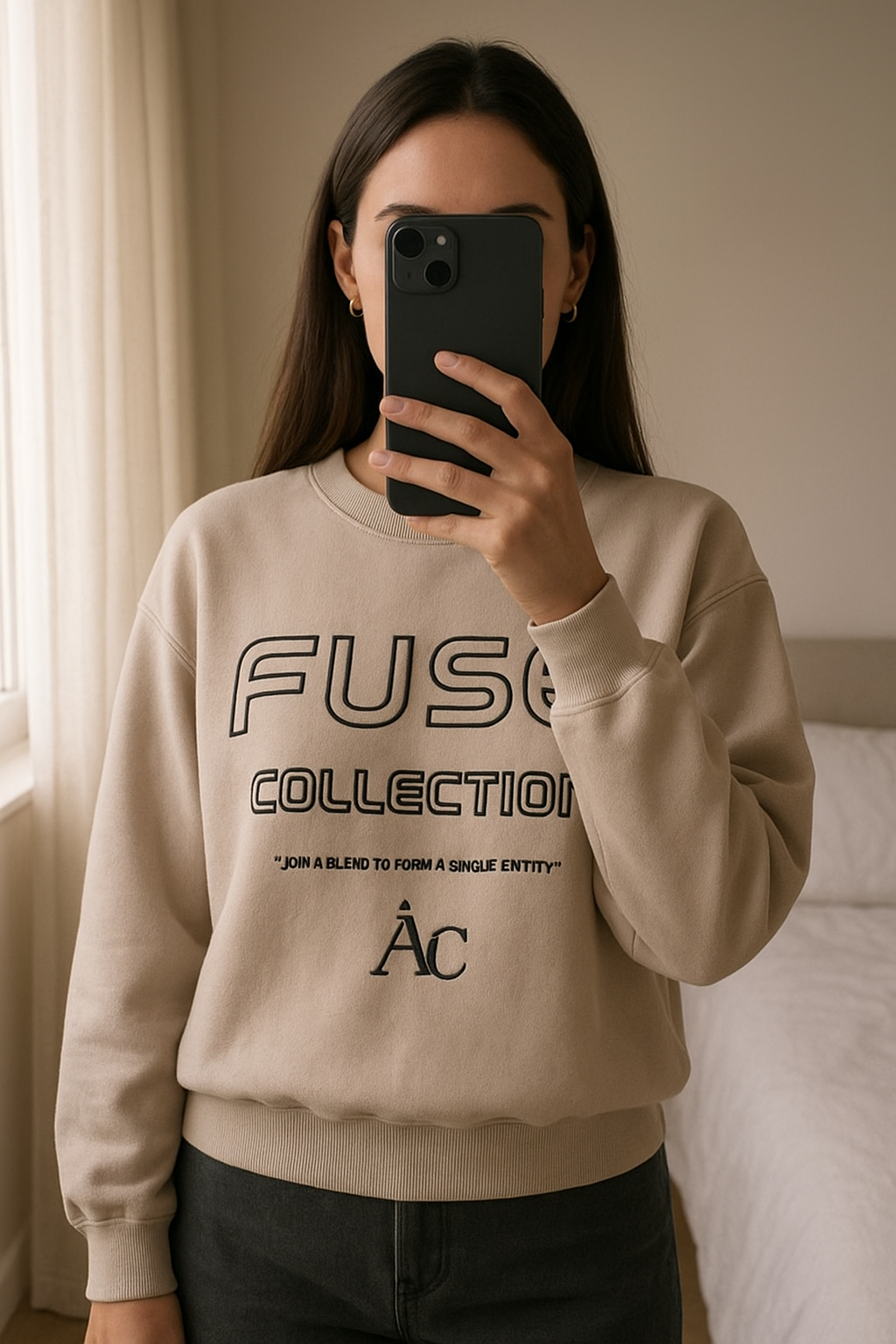 Angelle Collection Cream Oversized Sweatshirt – Women’s Size M (12-14) standing straight facing the camera, in a softly lit bedroom setting, with gentle natural light filtering through a window.
