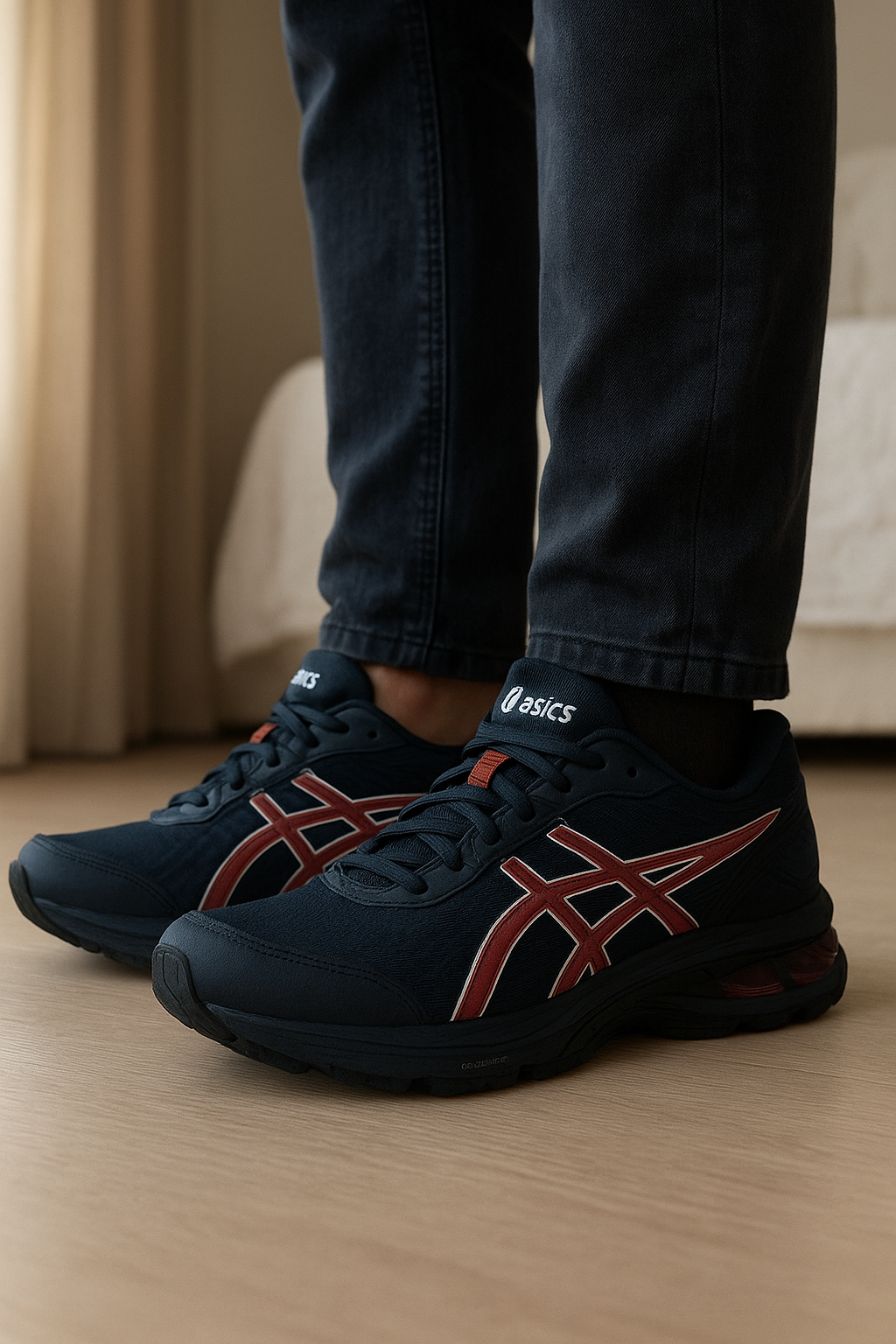 Asics Gel Quantum 360 debout, face à la caméra, dans une chambre à la lumière douce, avec une lumière naturelle filtrant par la fenêtre.