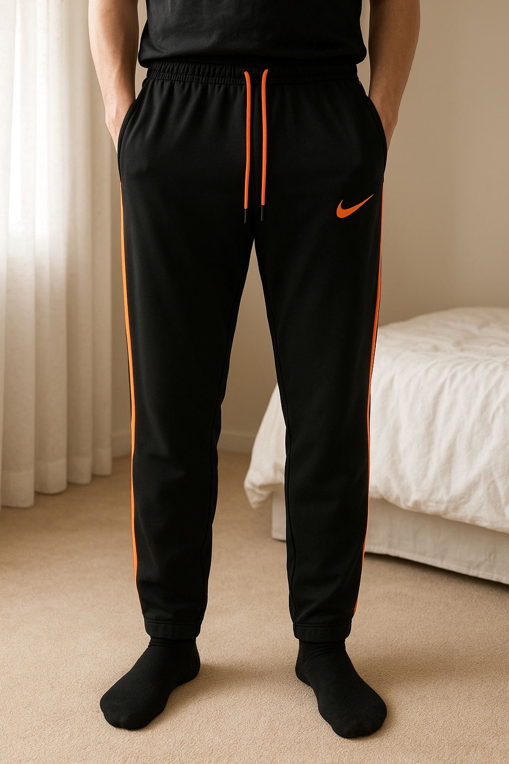 Bas de survêtement Nike noir et orange – Taille M – Très bon état debout, face à la caméra, dans une chambre à la lumière douce, avec une lumière naturelle filtrant par la fenêtre.