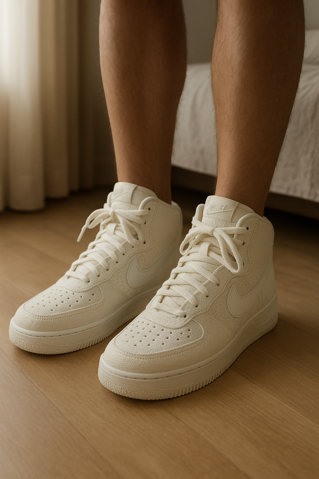 Basket Nike Air debout, face à la caméra, dans une chambre à la lumière douce, avec une lumière naturelle filtrant par la fenêtre.