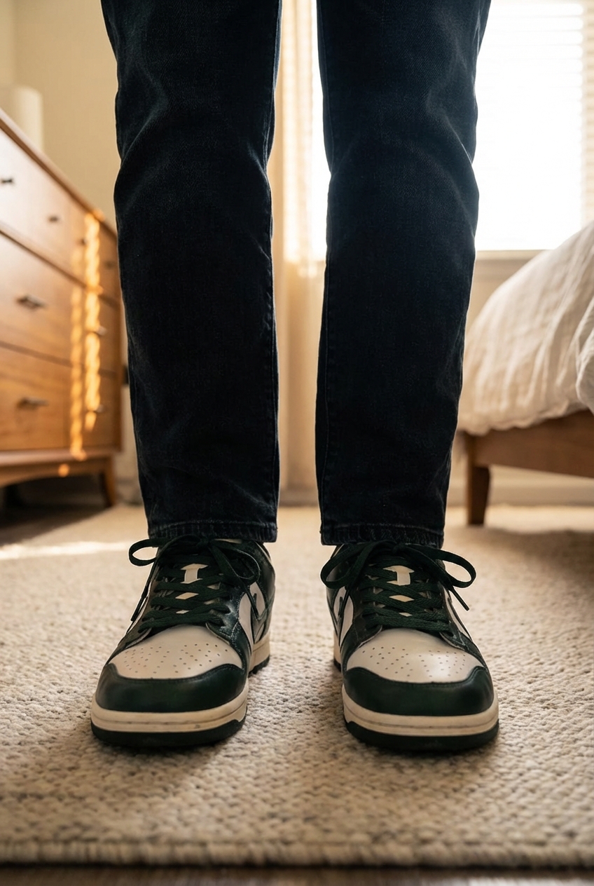 Baskets Nike 43 debout, face à la caméra, dans une chambre à la lumière douce, avec une lumière naturelle filtrant par la fenêtre.