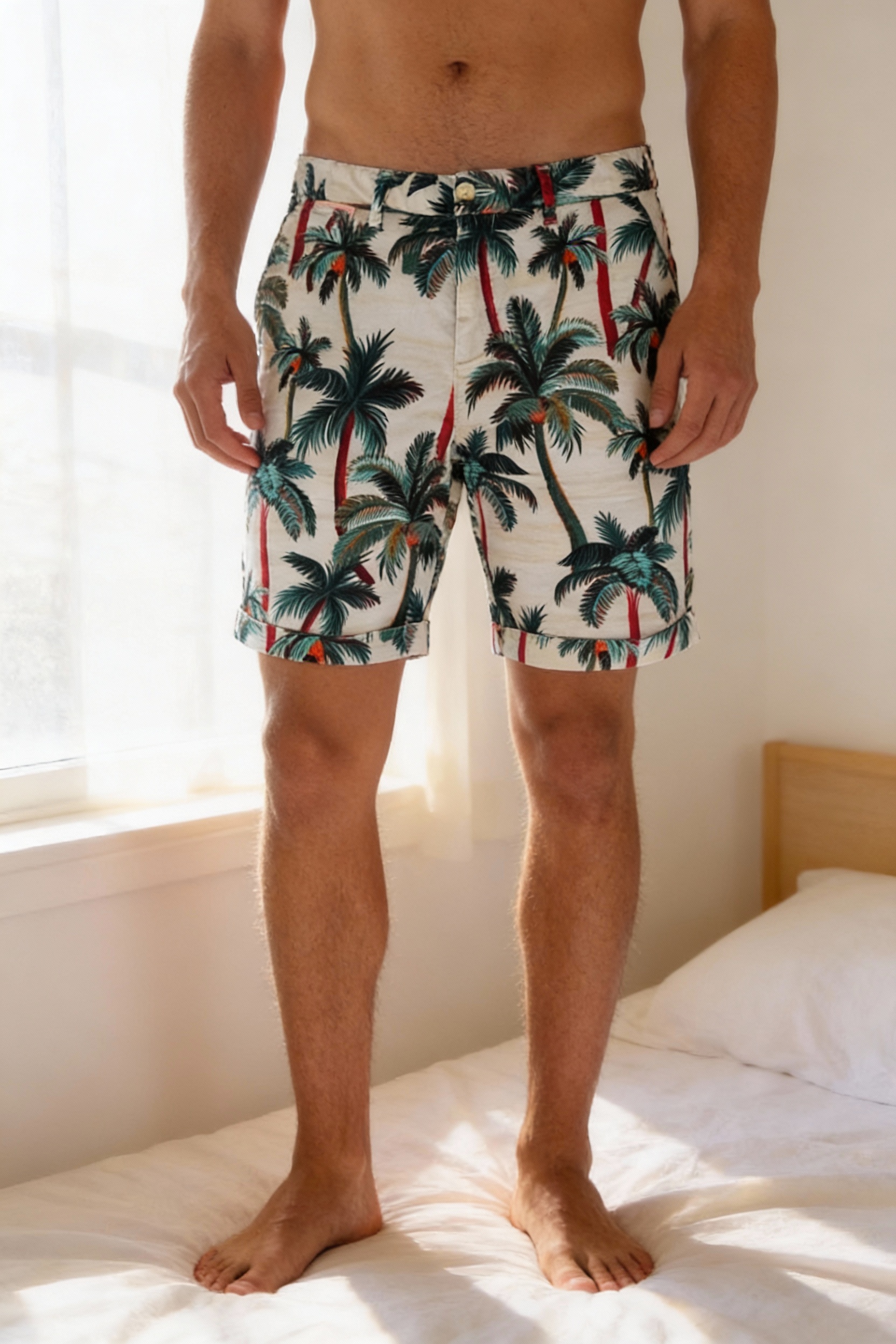 Bermuda Scotch & Soda T28 / S debout, face à la caméra, dans une chambre à la lumière douce, avec une lumière naturelle filtrant par la fenêtre.