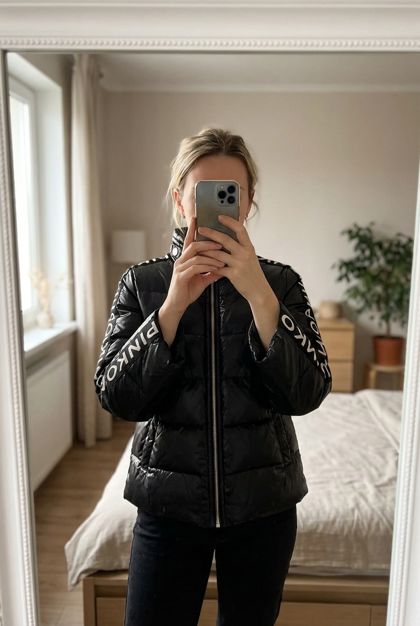 Black PINKO kimono puffer jacket in piedi, rivolto verso la fotocamera, in una camera da letto con luce soffusa e luce naturale che filtra dalla finestra.