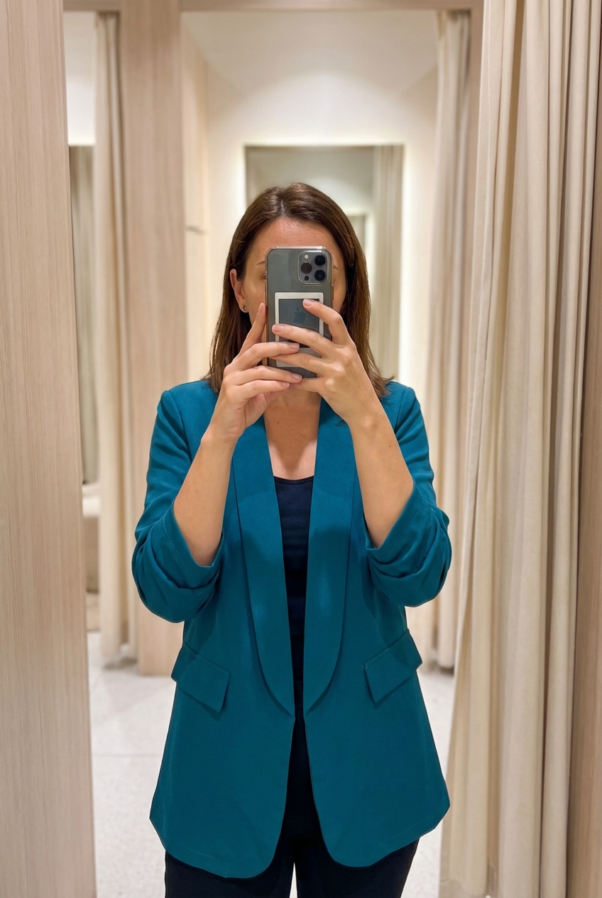 Una persona in Blazer Aperto con Manica Arricciata - Blu Ottanio Cod.3183 in piedi, rivolto verso la fotocamera, in un camerino in stile boutique con specchio e decorazioni neutre.