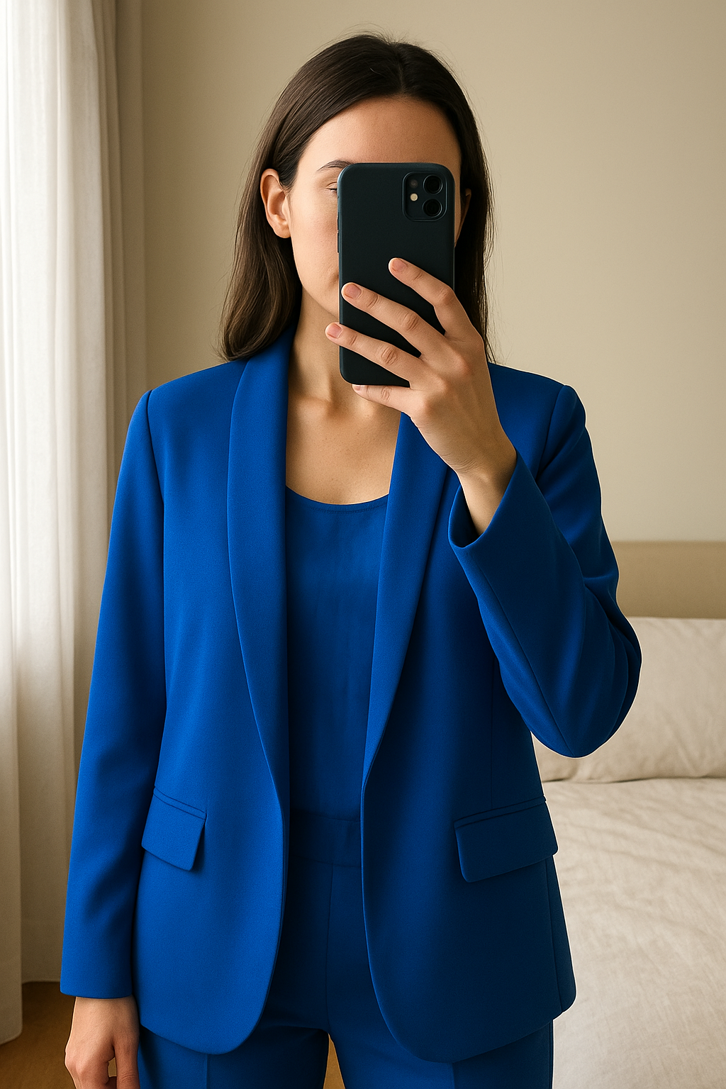 Blazer azul Klein de pie, mirando a la cámara, en un dormitorio con luz suave y natural filtrándose por la ventana.