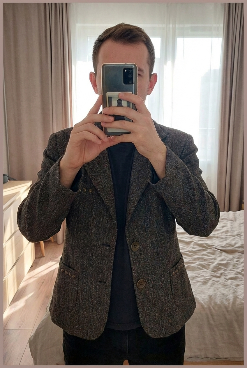 🧥 Blazer Belchis Firenze Made in Italy – Tg 48 – Stile Sartoriale Particolare in piedi, rivolto verso la fotocamera, in una camera da letto con luce soffusa e luce naturale che filtra dalla finestra.