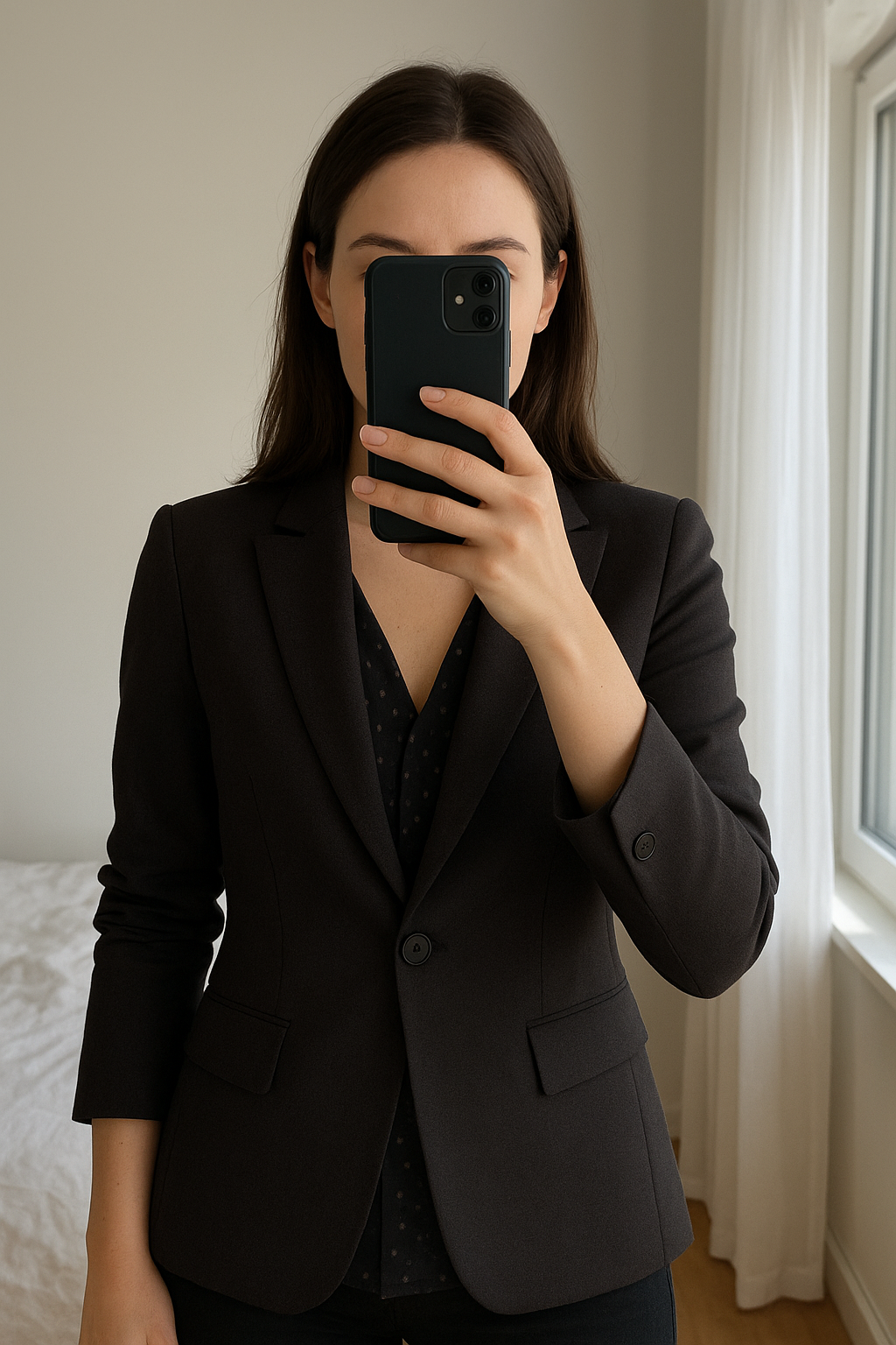 Blazer cach cache debout, face à la caméra, dans une chambre à la lumière douce, avec une lumière naturelle filtrant par la fenêtre.