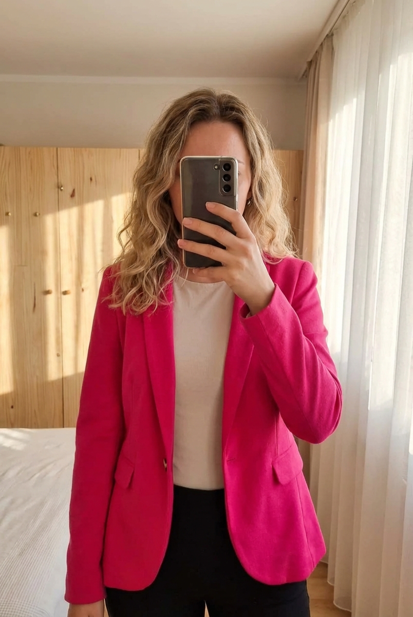 Blazer fushia debout, face à la caméra, dans une chambre à la lumière douce, avec une lumière naturelle filtrant par la fenêtre.