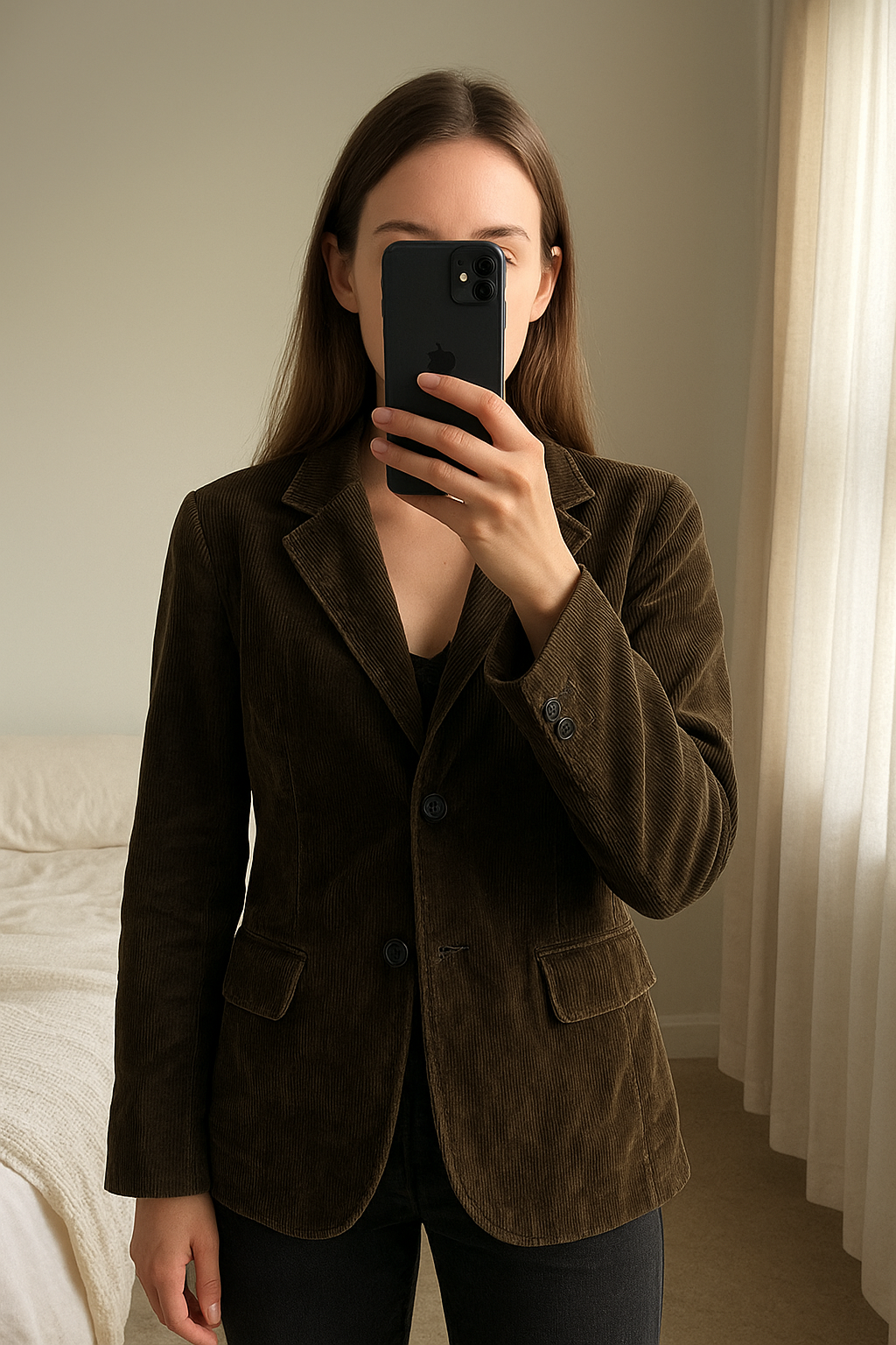 Blazer oversize velours côtelé debout, face à la caméra, dans une chambre à la lumière douce, avec une lumière naturelle filtrant par la fenêtre.