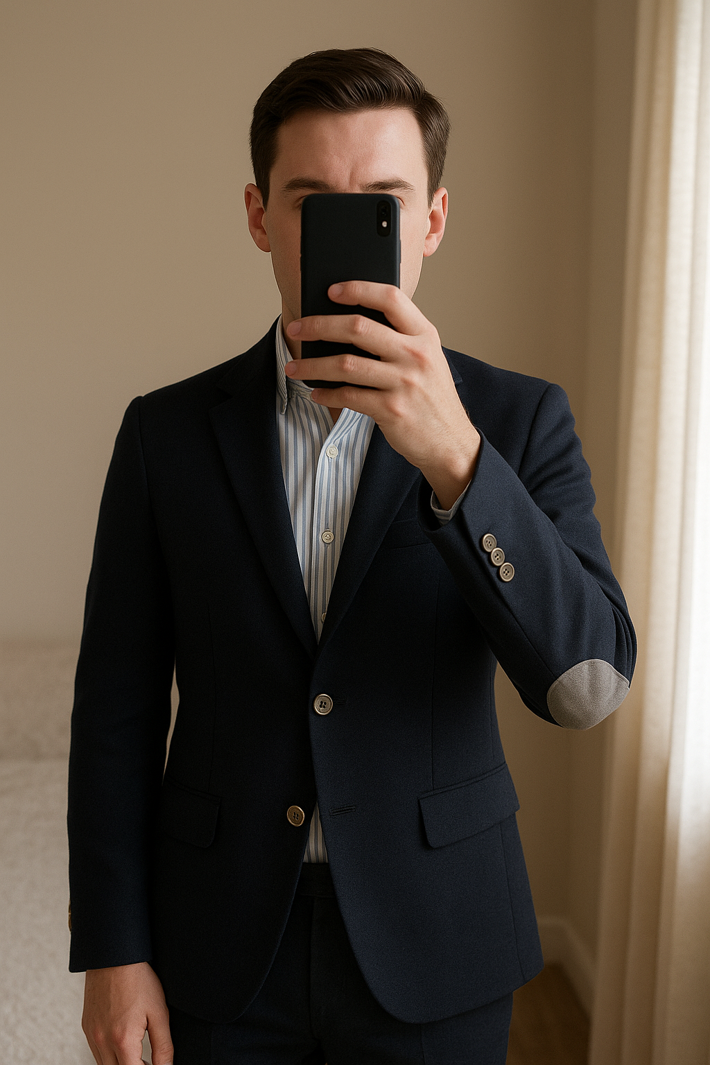 Blazer SFERA taille 52 bleu marine neuf slim fit debout, face à la caméra, dans une chambre à la lumière douce, avec une lumière naturelle filtrant par la fenêtre.
