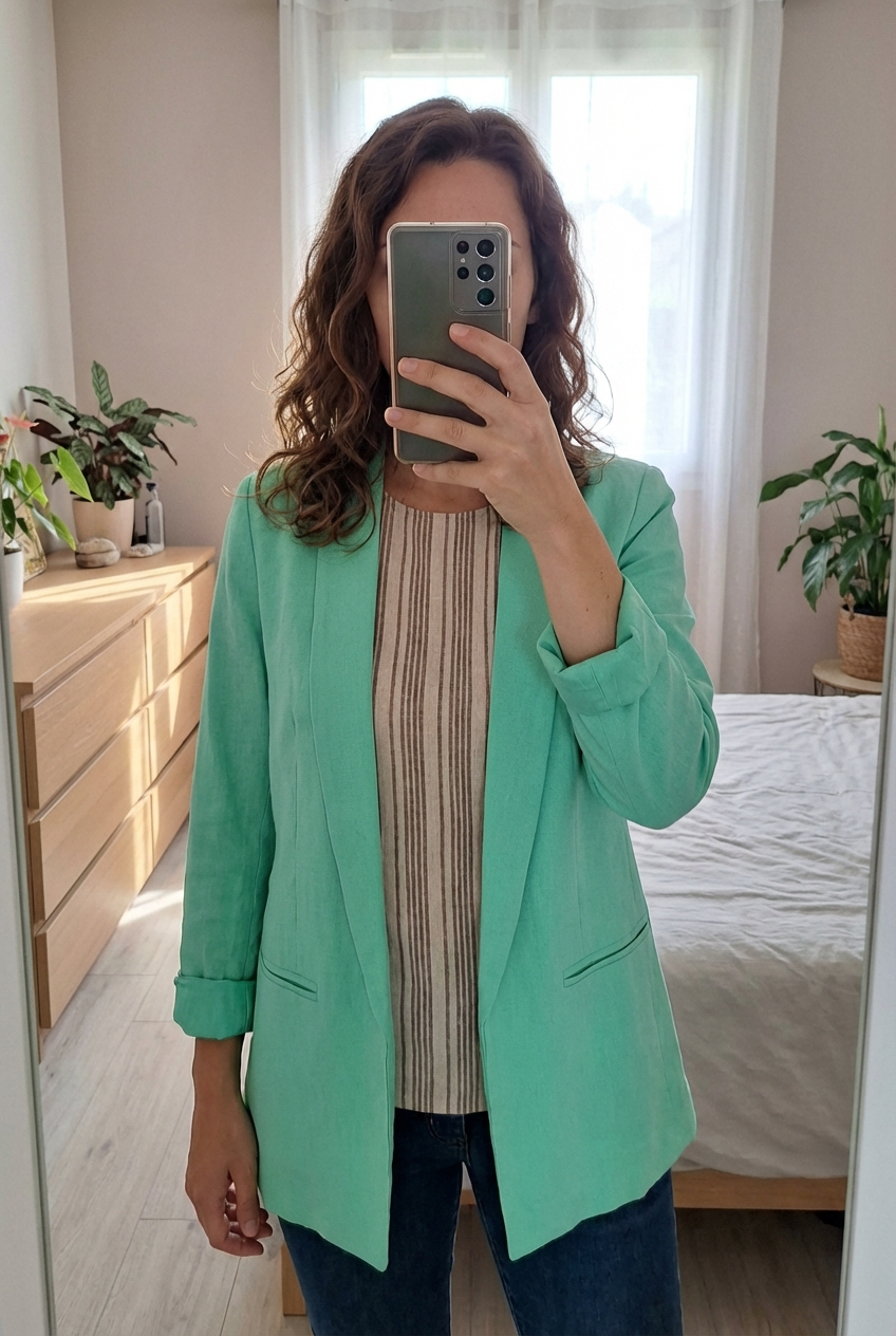 Une personne en Blazer vert d’eau – Kiabi – Neuf – Taille 36 (convient 34/38) debout, face à la caméra, dans une chambre à la lumière douce, avec une lumière naturelle filtrant par la fenêtre.