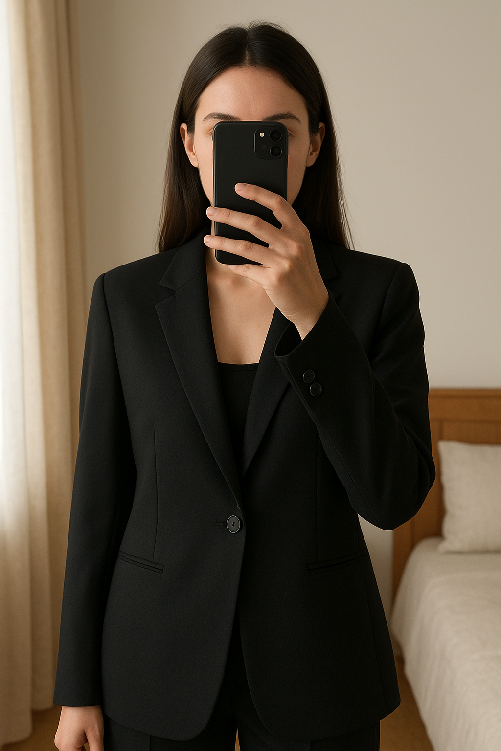 Blazer Zapa Taille 38 – Intemporel et chic debout, face à la caméra, dans une chambre à la lumière douce, avec une lumière naturelle filtrant par la fenêtre.