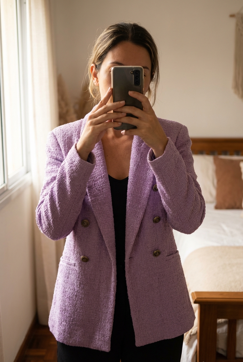 Une personne en Blazer Zara Lilas Taille M debout, face à la caméra, dans une chambre à la lumière douce, avec une lumière naturelle filtrant par la fenêtre.