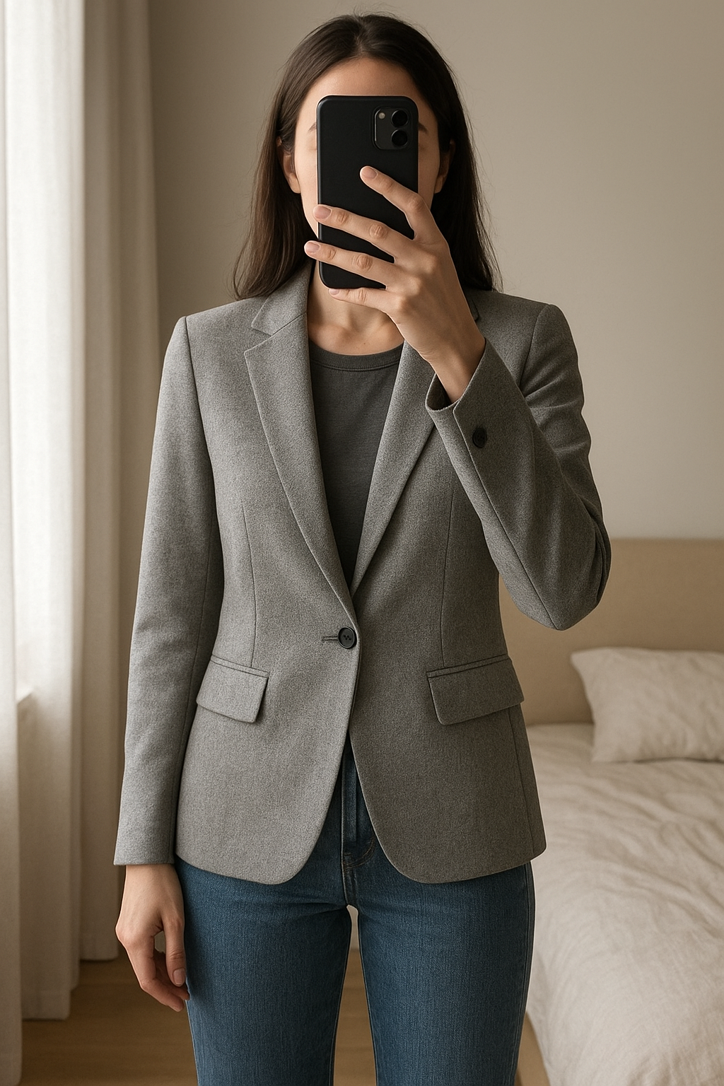 Blazers camaïeu taille s debout, face à la caméra, dans une chambre à la lumière douce, avec une lumière naturelle filtrant par la fenêtre.
