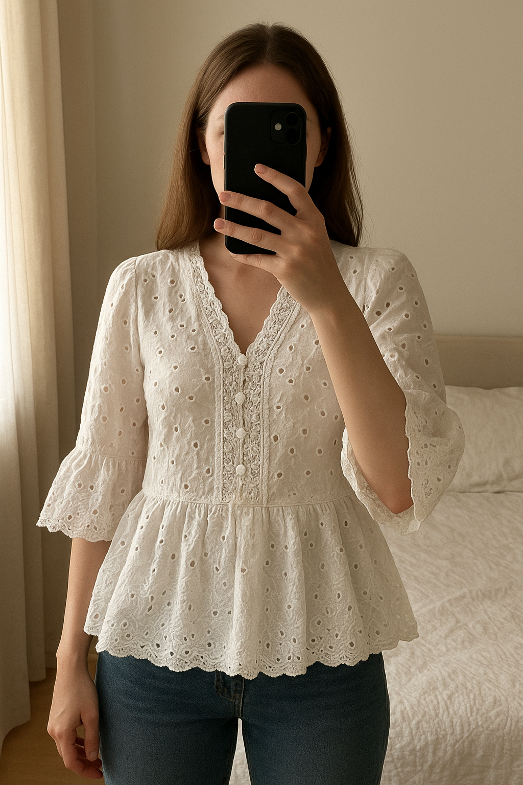 Blouse a dentelle blanche DIXIE debout, face à la caméra, dans une chambre à la lumière douce, avec une lumière naturelle filtrant par la fenêtre.