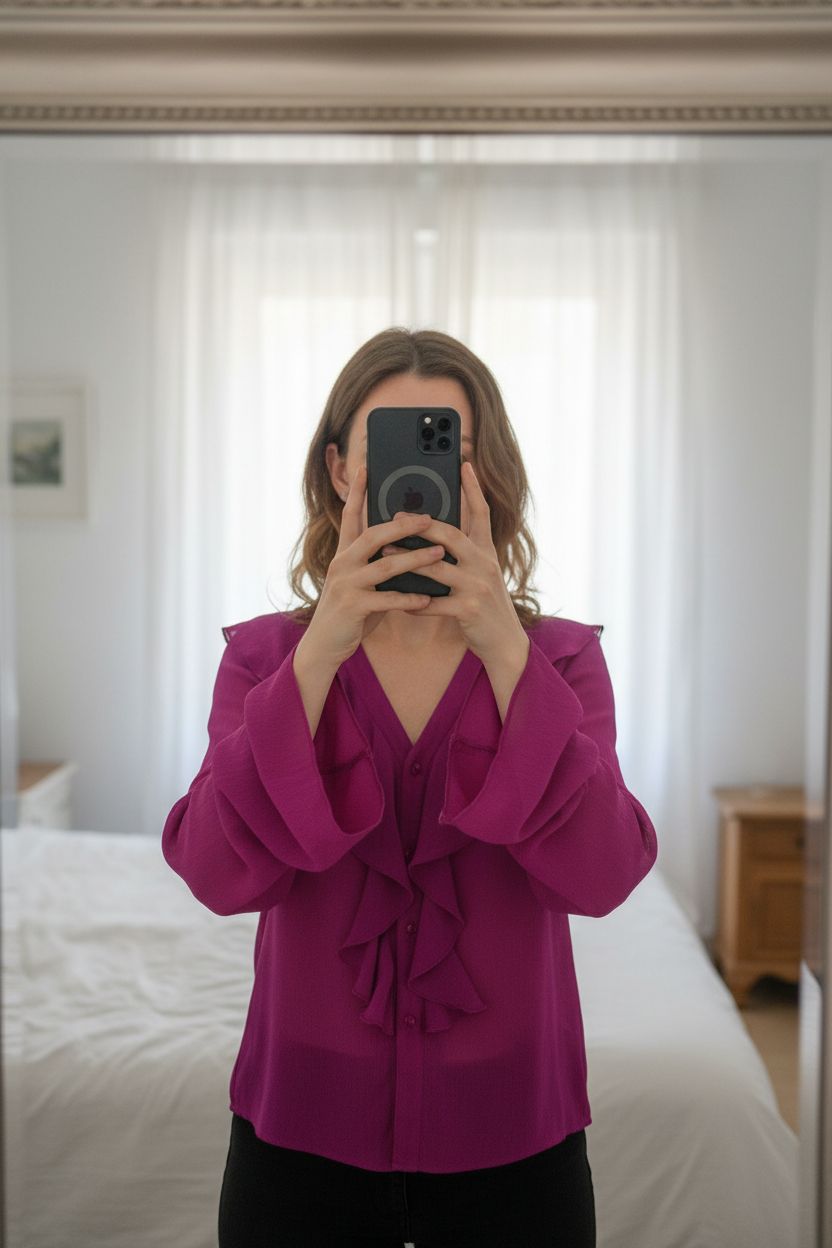 Blouse à boutons et frange debout, face à la caméra, dans une chambre à la lumière douce, avec une lumière naturelle filtrant par la fenêtre.