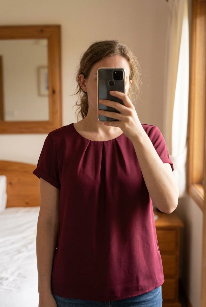 Blouse camaïeu taille 38 bordeaux debout, face à la caméra, dans une chambre à la lumière douce, avec une lumière naturelle filtrant par la fenêtre.