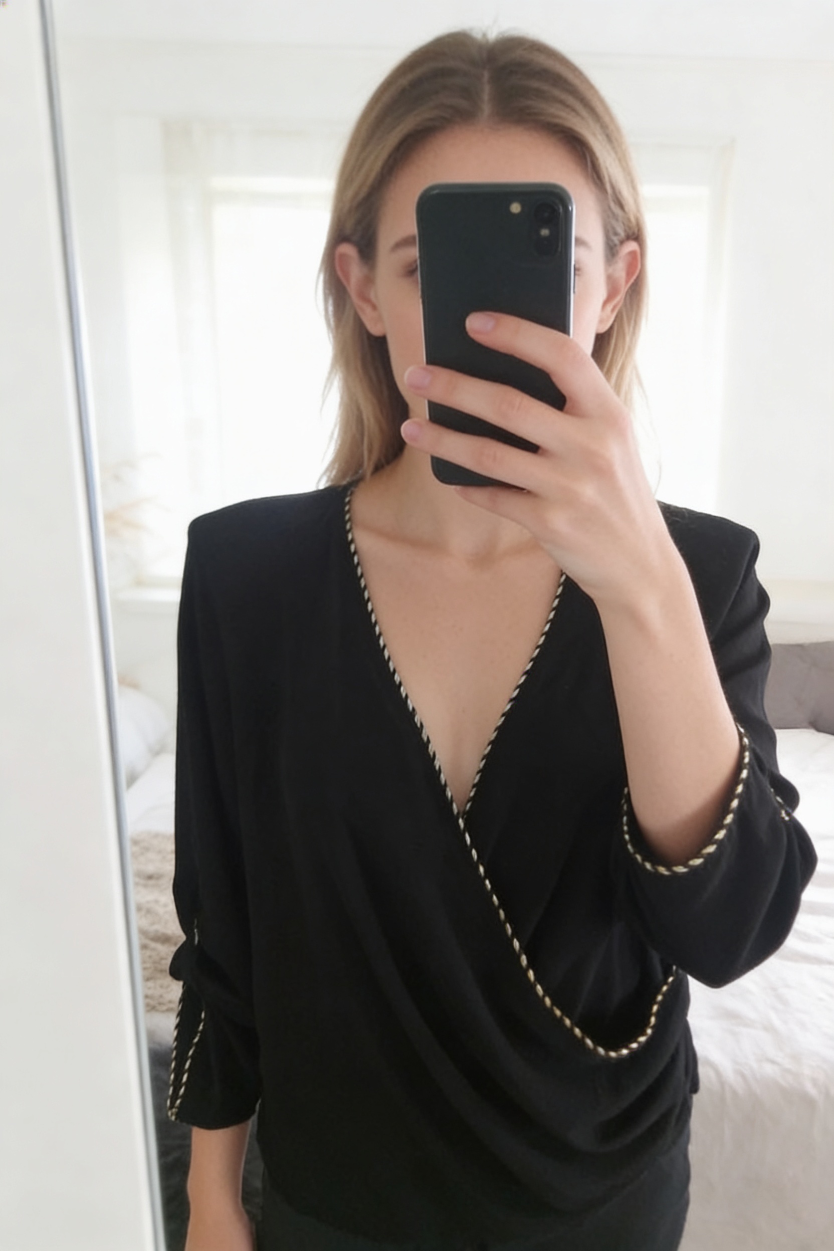 Blouse fluide Unika Paris S debout, face à la caméra, dans une chambre à la lumière douce, avec une lumière naturelle filtrant par la fenêtre.