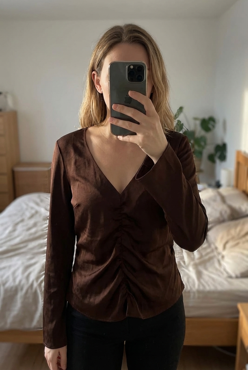 Blouse manches longues debout, face à la caméra, dans une chambre à la lumière douce, avec une lumière naturelle filtrant par la fenêtre.