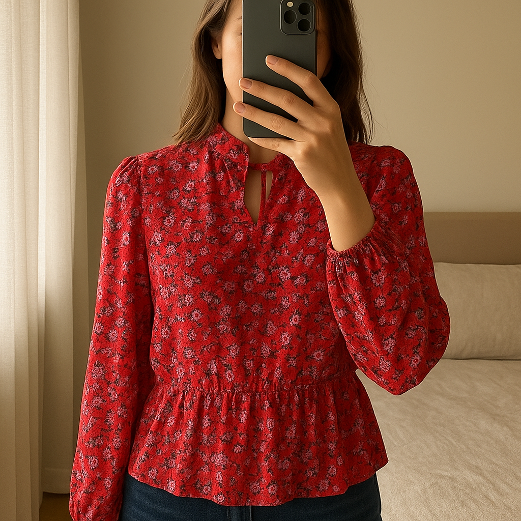 Blouse Pimkie T34 debout, face à la caméra, dans une chambre à la lumière douce, avec une lumière naturelle filtrant par la fenêtre.